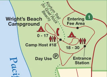 Call Reserve America for a reservation 48 hours to 7 months in advance. 1-800-444-PARKIn our peak season there are 99 campsites available. We offer token operated hot showers, flush toilets, and a trailer sanitation dump station. Maximum trailer length is 31' and hook-ups are not available. The day use area includes a boardwalk that overlooks a classic sandy beach. No dogs, fires or horses are allowed on the beach as a measure to protect the snowy plovers. The Western Snowy Plover is listed under the Federal Endangered Species Act as a threatened species. Loss of nesting habitat is due to human development, horses, invasion of European beach grass and predation by ravens, foxes, domestic dogs and cats. Maps Courtesy of California State Parks