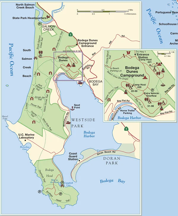Bodega Dunes- Leashed dogs allowed in Campground. No dogs on Bodega Dunes Beaches